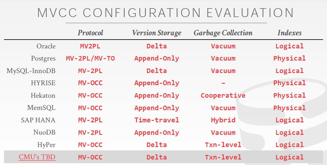 - 我将txn-id称为“锁”,CMU PPT中也说的是用lock。但大部份资料都是说它完全不用锁。可能是在说txn-id这个值可以通过cas(lock free)保证并发安全,所以说“无锁”?可能是在说read时不用加锁?可能是说事务级别的加锁(区别于2PL之类,事务访问前要互斥锁、共享锁)?http://nitttrc.edu.in/nptel/courses/video/106104135/lec40.pdf 估计是区别于2PL。