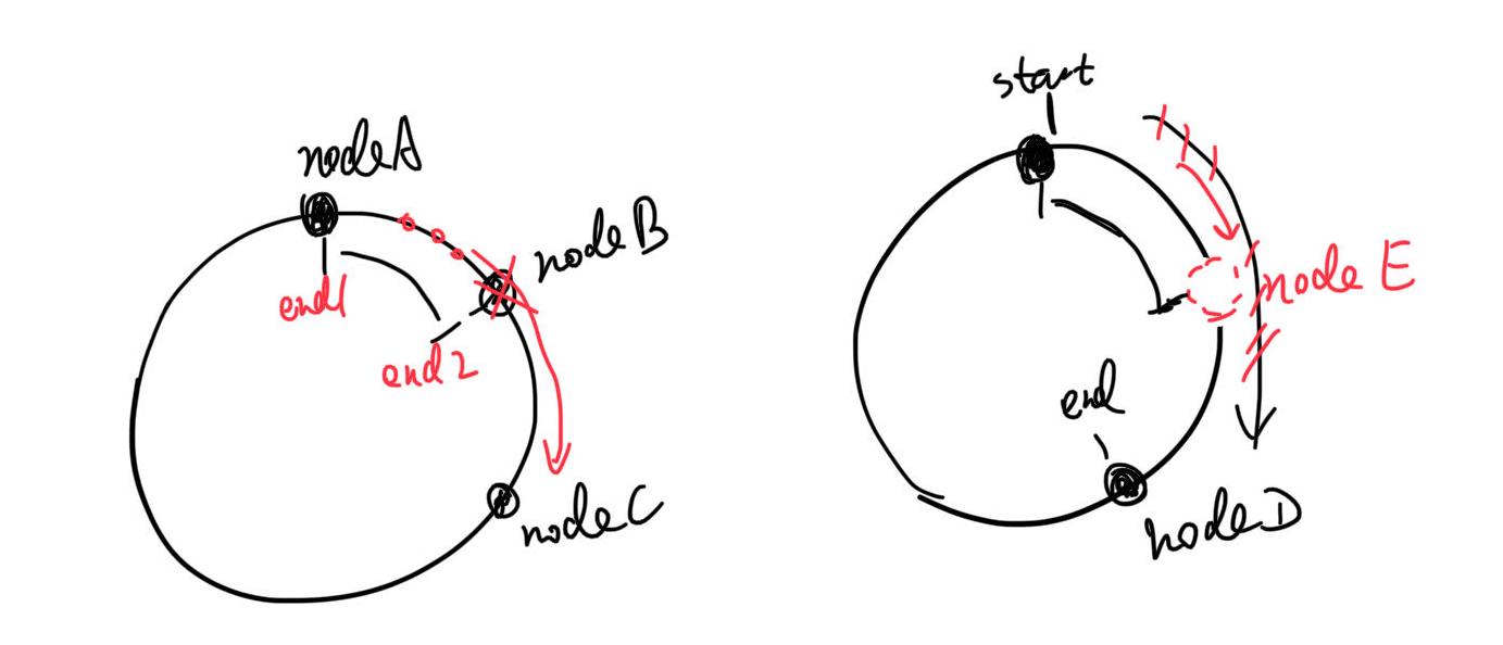 如果中间某个服务器down了,反正算法是往后找到第一个服务器,它还是会被处理。当然这个就要求“数据可以被任何server处理”,不能是特别的。比如,相关数据只在某个节点,其他节点获取不到,处理条件都不满足。当然这是理想条件,现实很多也不满足,但它们涉及到的数据也可以是多节点都存有备份,但又不至于所有节点都需要。这个也等于缩容,受影响的数据是“会落到这一下线节点的数据”,我们称为nodeB,将前一个节点nodeA的末尾片记为end1,当前节点末尾片为end2,也就是(end1, end2]区间的数据原本应该找这个节点B,但它下线了,就会变成去找下一个节点nodeC。其他片上的数据不会受到影响。虚拟哈希环不会改变大小,永远的2^32片。如下图左边所示。